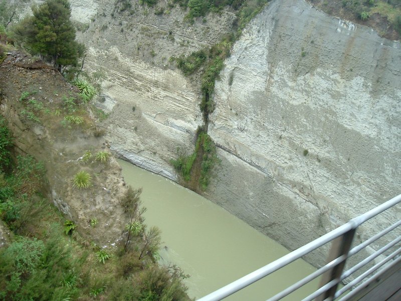 The trip down wasn't very memorable, photographically - it rained much of the way, and from Waiuouru down to Taihape the skies were so dark any photos just reflected the train. After Taihape the weather cleared a little and the camera-waving nuts among us were invited back out onto the platform as we went over the high Rangitikei viaducts. These are very dramatic and surprising - the Rangitikei valley has a wide flat floor, maybe a mile wide, into which the river has carved a sheer-sided gorge 250 feet deep and not much wider. So the train will be running fast across the fields in the dead flat floor of a wide valley when all of sudden it's in mid-air with an enormous drop below - it always catches strangers by surprise. Anyway, on this occasion, my spare set of batteries chose the exact moment of crossing the first viaduct to go flat. Oh the frustration.
