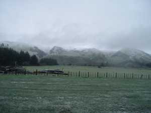 | Heading up the Rangitikei valley with snow on the hills ahead |