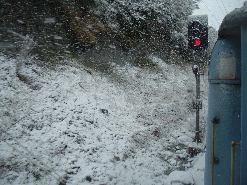 State Highway 1 when we ran alongside it was deserted except for a couple of trucks trying to spread grit in a futile attempt to keep it open. I used up the flash card in my camera, stuck in a spare card, changed batteries and carried on clicking (thank the gods for digital!). I couldn't see what I was taking - just a white blur in the viewfinder - but a surprising number - better than half - actually came out reasonably well. Well done Fuji.