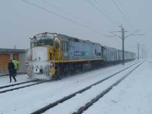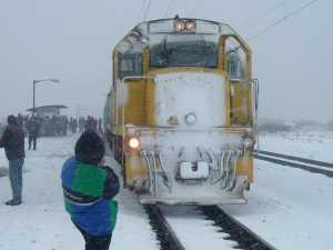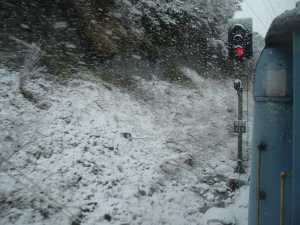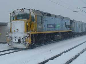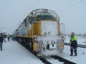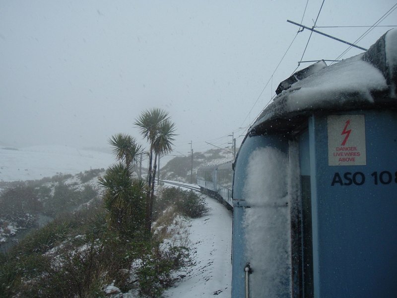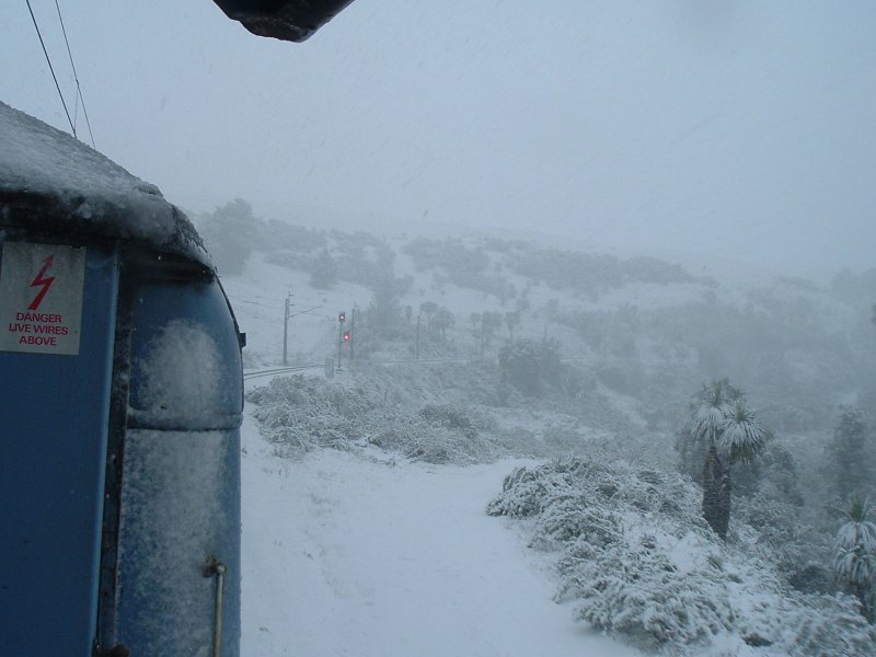 Up at Waiouru, the snow had eased a bit, the train stopped to give the passengers who had been watching the snow from the comfort of their carriages (and us cold but ecstatic idiots from the van) a chance to walk around in it. I took some photos of the DX with the front plastered in snow. The train crew threw snowballs at each other. My hands were too cold to touch the stuff.